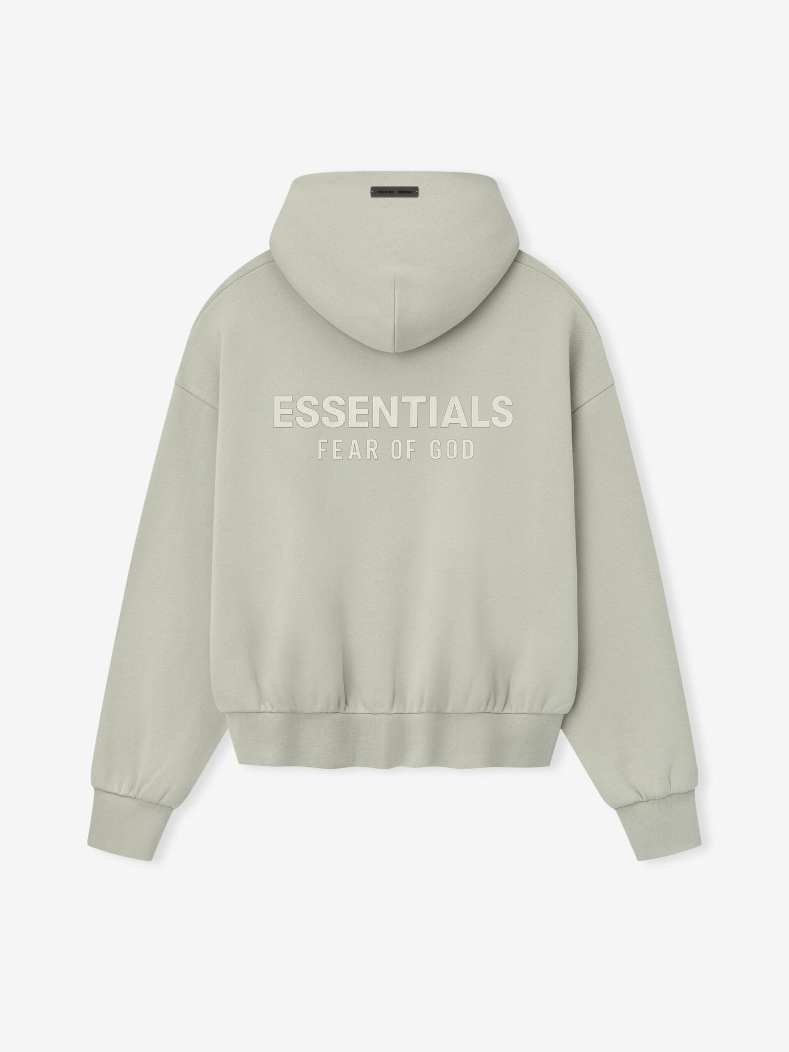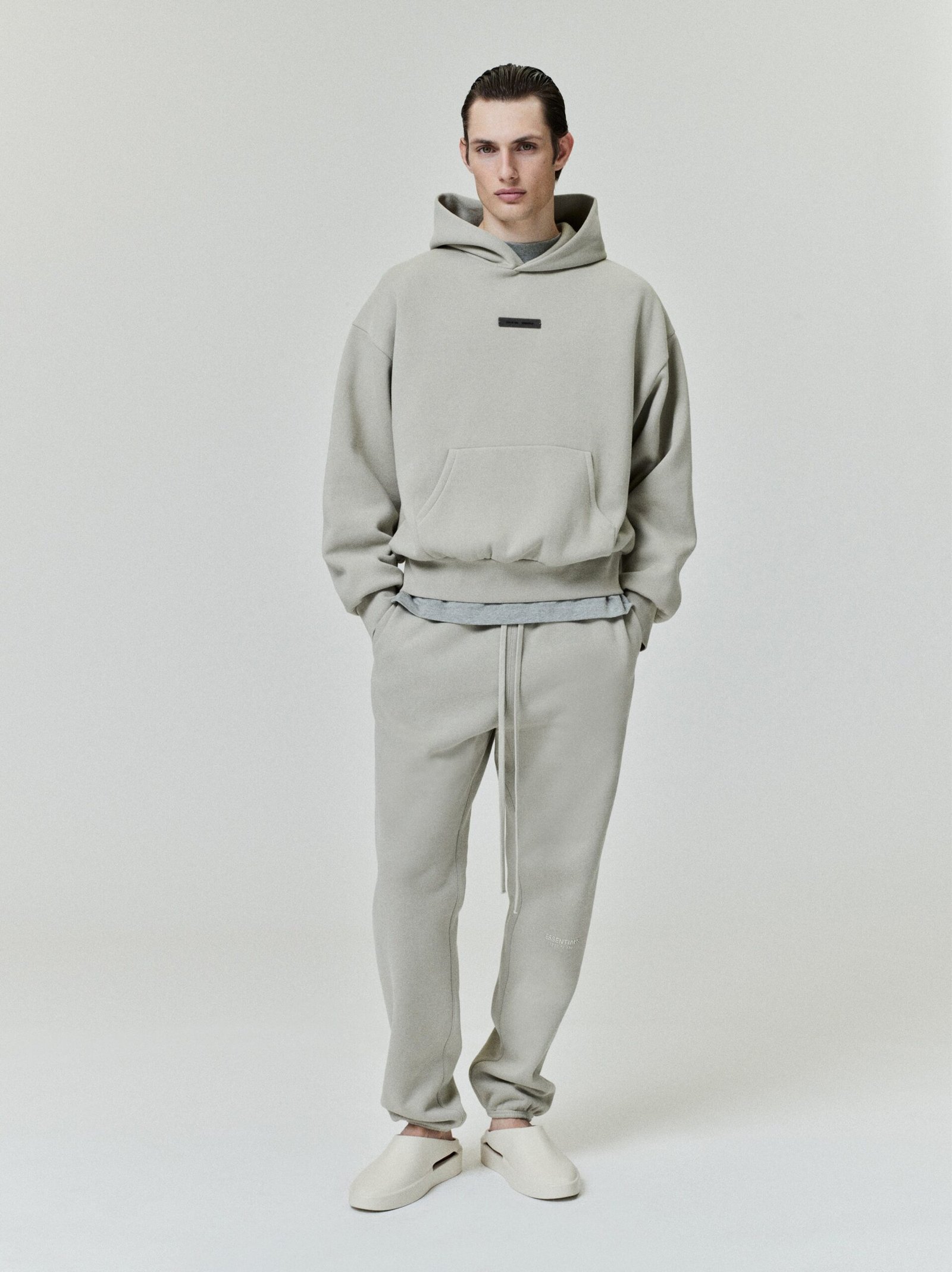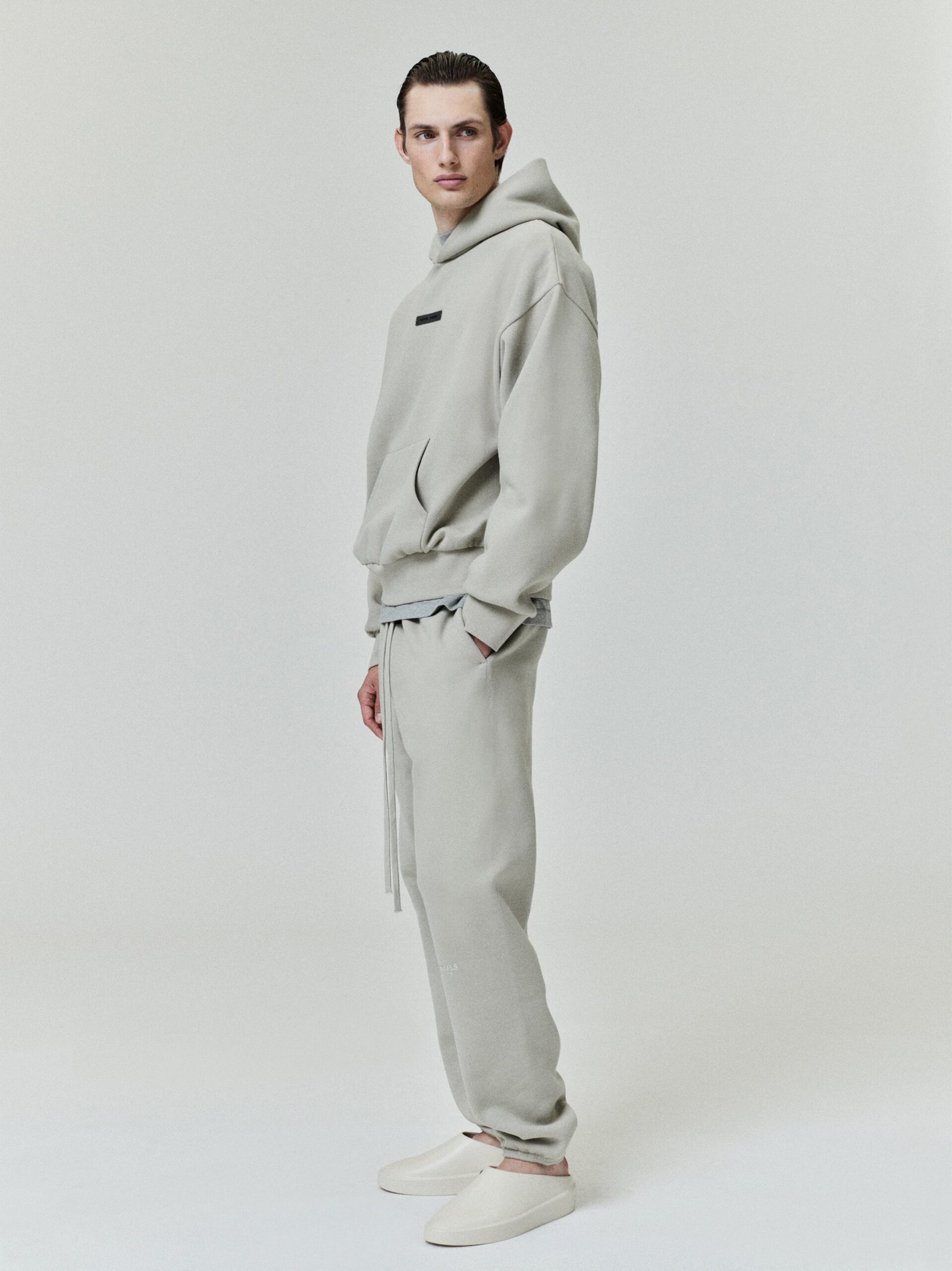 Authentic Fear of God Essentials Hoodie in Heather Grey. Features 380gsm core fleece and the new beveled metallic logo. Signature relaxed fit for daily comfort.