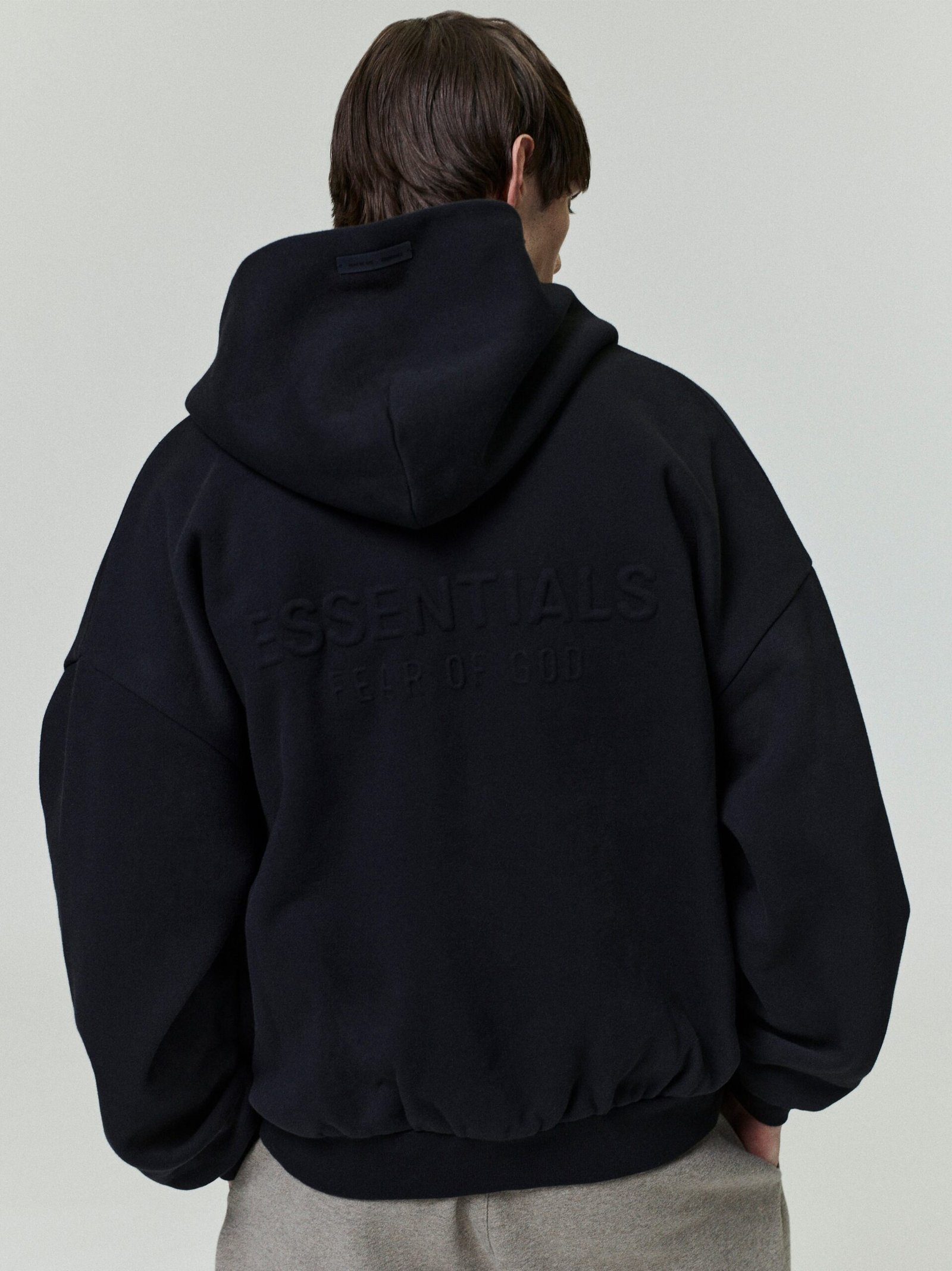 Fear of God Essentials Embossed Logo Zip Up Hoodie – Authentic 480gsm Black Fleece Jacket