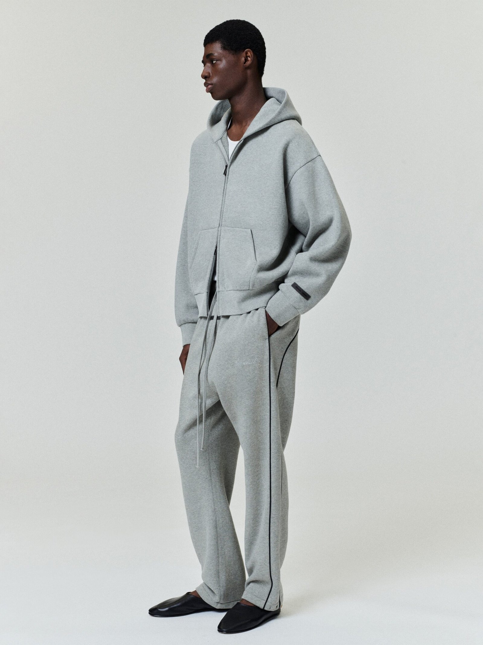 Full lifestyle views of a model wearing the authentic Abbey Stone Essentials full-zip hoodie and matching relaxed joggers, curated by Zizzle LLC.