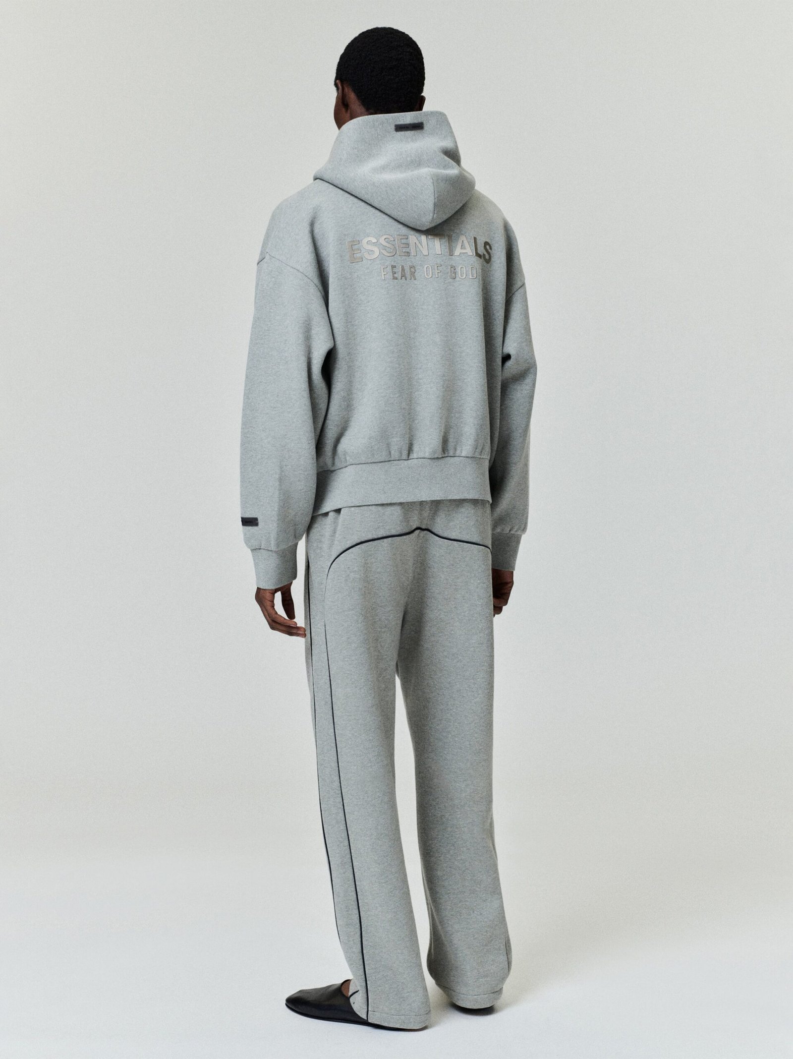 Authentic Fear of God Essentials Zip-Up Hoodie in Heather Grey. Heavyweight 380gsm fleece with a relaxed fit and full-zip front. Premium street style.